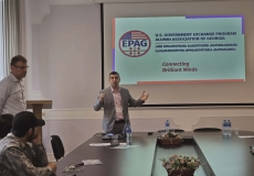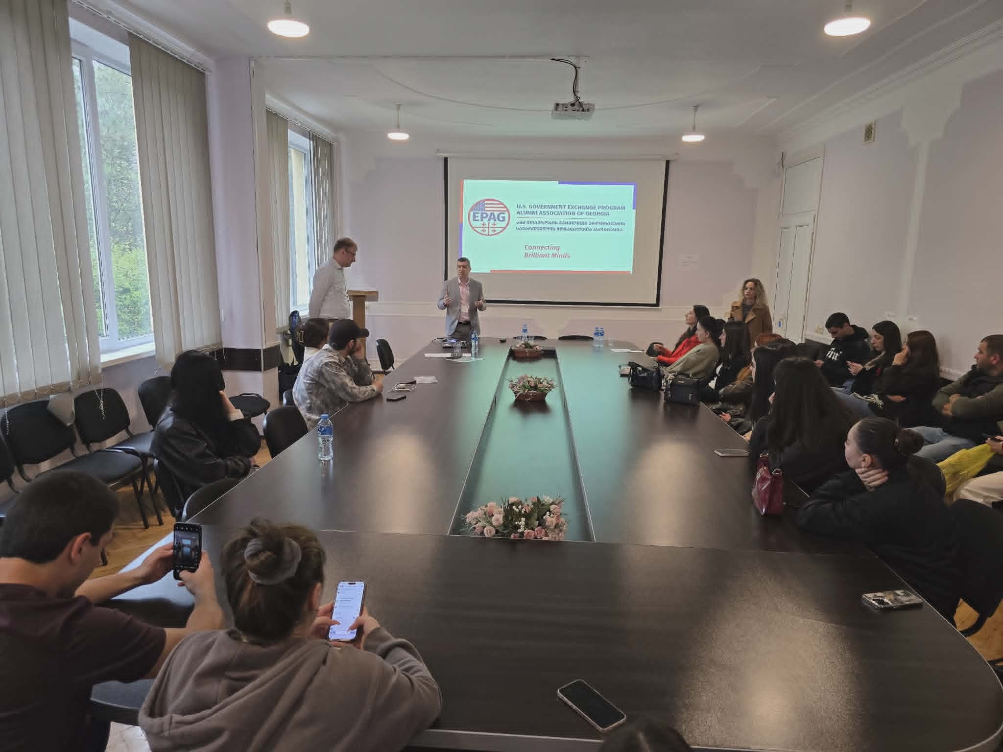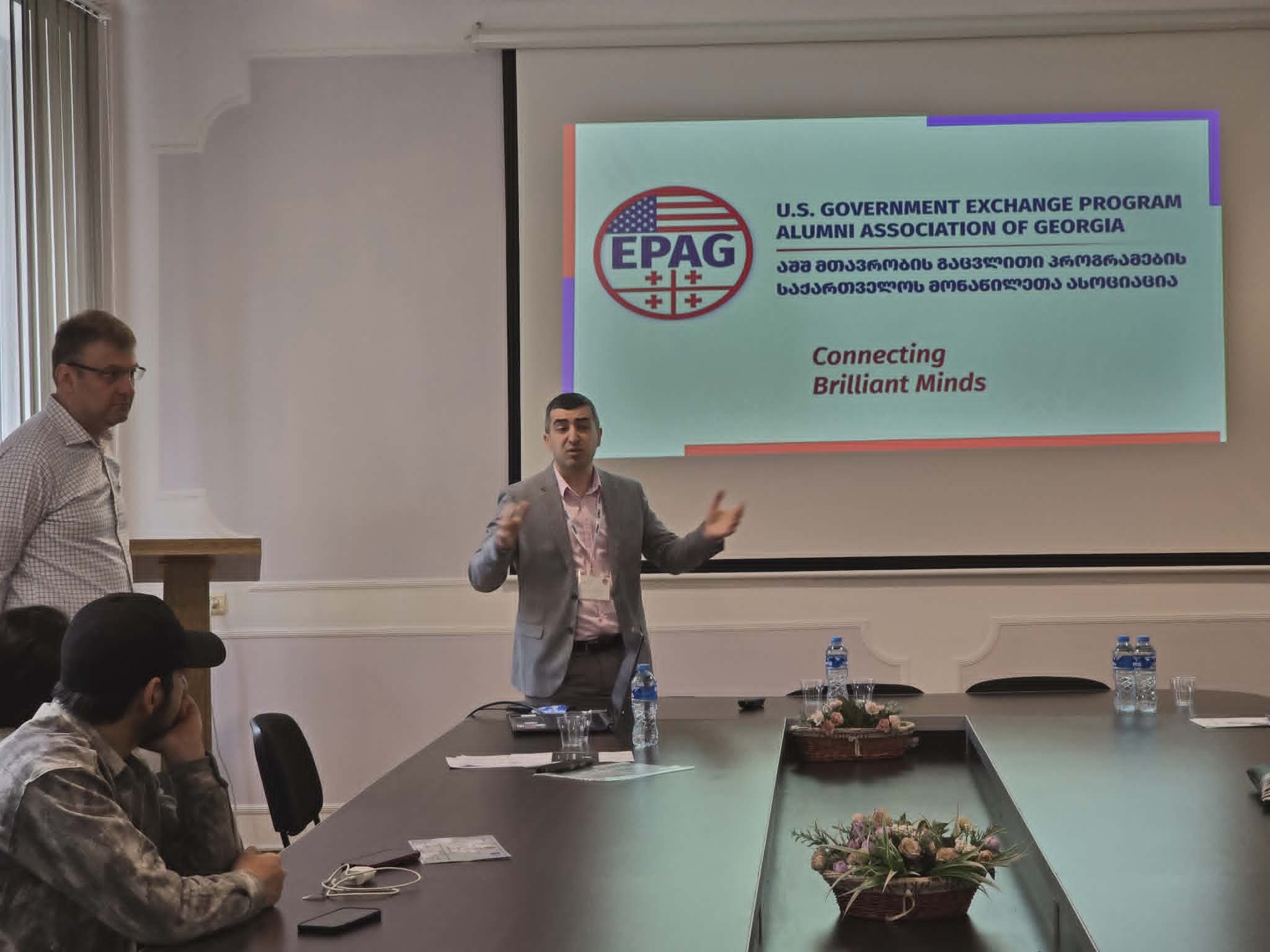 შეხვედრის სპიკერები იყვნენ PhD, MPA ჩრდილოეთ ტეხასის უნივერსიტეტის სერტიფიცირებული ტრენერი საუნივერსიტეტო სწავლების მიმართულებით, ნოუ ჰაუ ტრენინგ ცენტრის დამფუძნებელი, EPAG-ის აღმასრულებელი საბჭოს წევრი დავით დარსაველიძე და MBA, ლონდონის ბიზნეს სკოლა, BNB Bank-ის სამეთვალყურეო საბჭოს წევრი, EPAG-ის აღმასრულებელი საბჭოს წევრი გიორგი არველაძე.